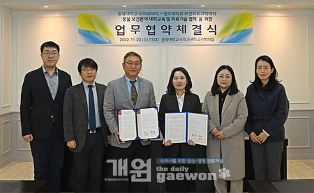 충북대 수의과대학(학장 현상환)이 지난 11월 23일(수) 청주대 보건의료과학대학과 동물 보건 분야 대학 교육 및 의료기술 협력을 위한 업무협약을 체결했다.