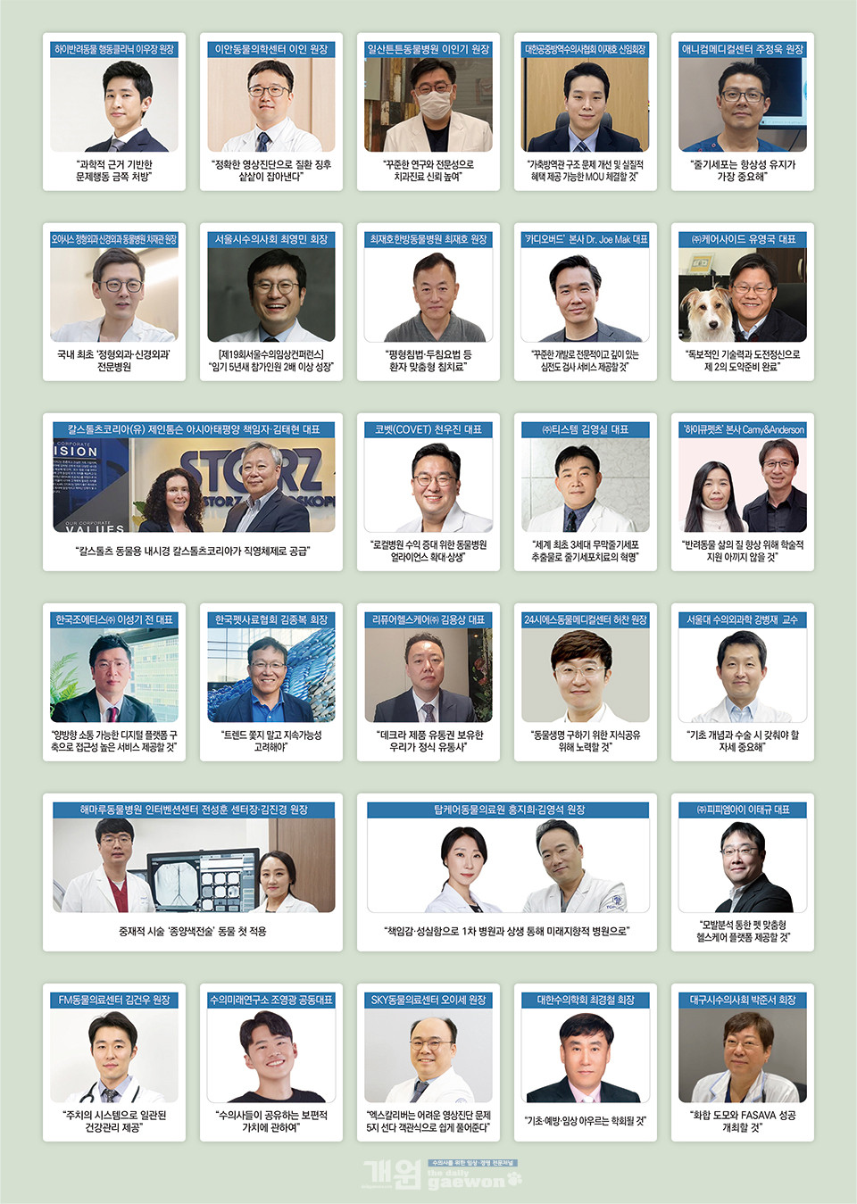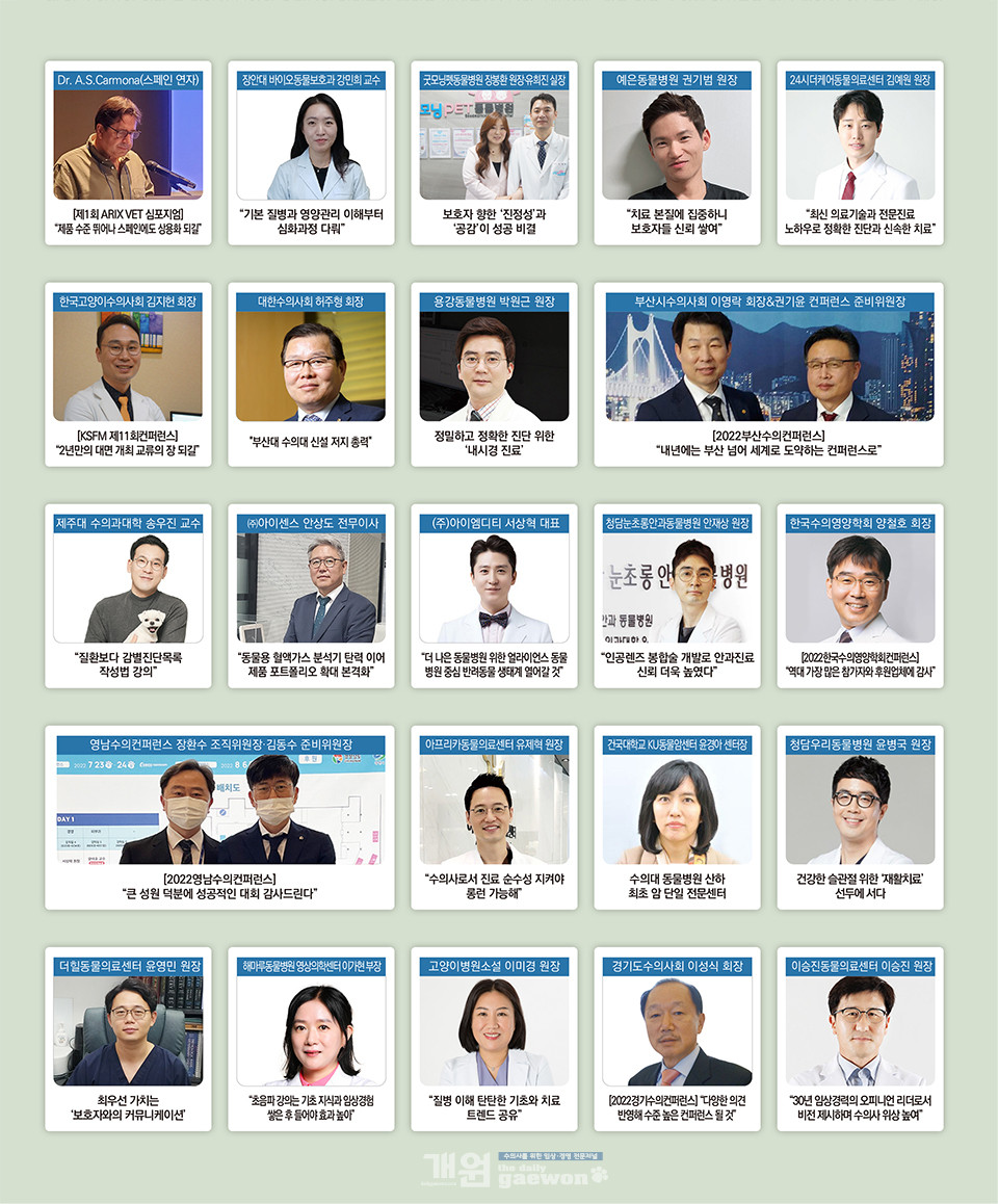 올 한해 동안 본지가 만난 55명의 수의계 인사들에게 감사의 말씀 드립니다. 본지 인기 코너인 클리닉 탐방과 이주의 연자, CEO인터뷰를 비롯해 각 단체 및 수의사회 회장 등 다양한 분야의 오피니언 리더들이 개원을 빛내주셨습니다. 내년에는 더욱 많은 수의계 인사들을 만나 다양한 이슈들을 소개하겠습니다. <편집자주>