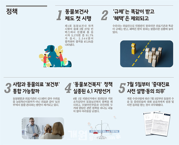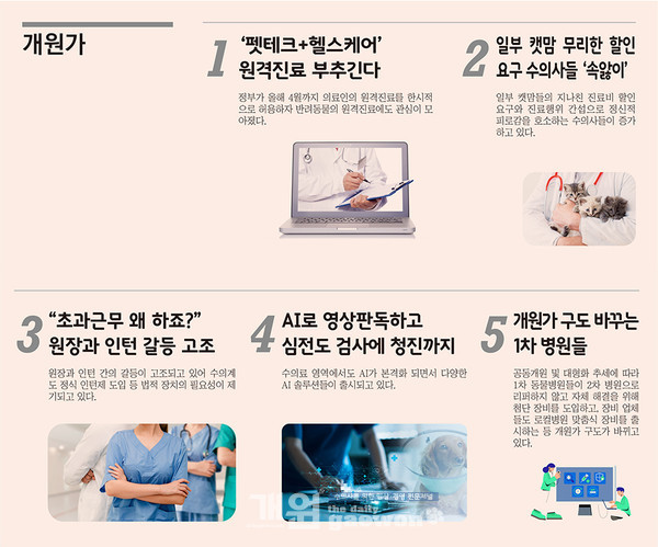 2022년 한해 동안 본지가 보도한 기사 중 독자들의 높은 관심을 받은 분야별 ‘Top 5’ 뉴스를 선정했다. 올해는 개원가에 펫테크와 펫헬스케어, AI 바람이 거세게 불었으며, 공동 개원과 대형화 추세가 가속화되면서 1, 2차병원의 구분이 없어지는 개원 형태에도 큰 변화가 있었다. 또한 병원 내부적으로는 캣맘과 인턴과의 갈등 문제에도 많은 공감을 나타냈다. 개원가의 새로운 먹거리로 줄기세포치료와 재활치료, 행동치료가 떠올랐으며, 젊은 수의사들의 광폭 행보도 뜨거운 관심을 모았다. 정책적으로는 ‘동물보건사’ 제도의 첫 시행을 비롯해 7월 5일부터 ‘중대진료 사전 설명·동의 의무’가 시행돼 높은 관심을 나타냈다. <편집자주>