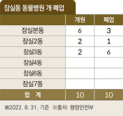 행정안전부 최신 데이터에 따르면, 송파구 잠실동은 1991년부터 동물병원이 개원하기 시작해 2022년 8월 31일까지 총 20개소가 개원, 이 중 10개소가 문을 닫고, 10개소가 개원을 유지해 절반의 개원 성공률을 나타내고 있다.