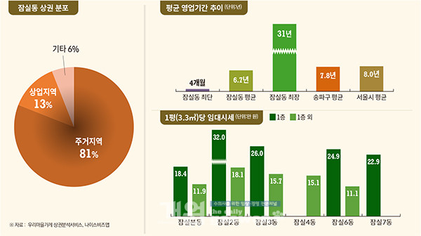 잠실동은 편리한 교통편과 최신 트렌드를 반영한 세련된 시설로 10대부터 30대까지 젊은 세대가 자주 찾는 지역 중 하나다. 최근 5년 사이 송리단길이 SNS를 통해 입소문이 퍼지며 유명해지자 잠실동은 송파구 내 탄탄한 유동인구를 보유한 곳으로 거듭났다.