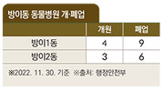 행정안전부 최신 데이터에 따르면, 송파구 방이동은 1993년부터 동물병원이 개원하기 시작해 2022년 11월 30일까지 총 22개소가 개원, 이 중 15개소(68%)가 문을 닫고, 7개소(32%)만 개원을 유지하고 있어 폐업율이 높은 지역이다.
