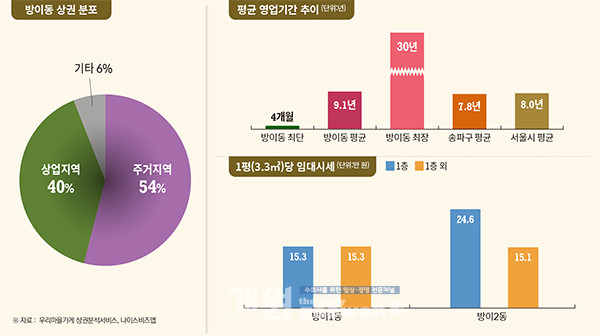 방이1동의 1평(3.3㎡)당 건물 평균 임대료는 15만3천 원 수준으로 건물 1층과 1층 외 임대료 차이가 거의 없다.