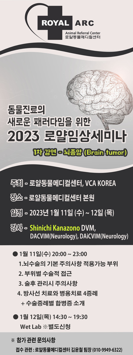 이번 강의는 ‘뇌종양(Brain tumor)’을 주제로 일본의 Shinichi Kanazono 수의사를 초빙, 뇌수술과 방사선치료의 병용치료 등 매우 심도 높은 강의를 다룰 예정이다.