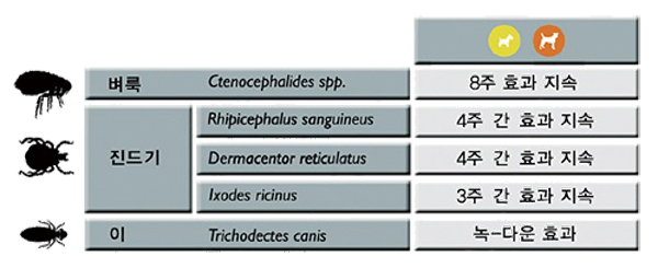또한 벼룩과 진드기에는 이미 입증된 효능을 자랑하고 있으며, 경제적인 가격과 소형견용과 중형견용, 대형견용으로 분리, 선택의 폭을 넓힌 것도 장점이다.