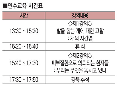 연수교육은 오후 1시 30분부터 5시 30분까지 진행된다. 강의는 송치윤(수원바른동물의료센터) 원장이 ‘발을 핥는 개에 대한 고찰: 개의 지간염’과 ‘피부질환으로 의뢰되는 환자들: 우리는 무엇을 놓치고 있나’를 연제로 피부질환 강의를 진행할 예정이다.