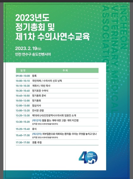 인천시수의사회(회장 박정현, 이하 인천지부)가 ‘2023년도 제1차 수의사 연수교육’을 오는 2월 19일(일) 송도컨벤시아에서 개최한다.