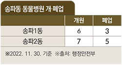 송파동 내 동물병원 평균 영업기간은 8.4년으로 송파구 평균(7.8년)과 서울시 전체 평균(8년) 보다 높은 수준으로 나타났다. 동물병원 최장 영업기간은 22년으로 2001년 개원한 A 동물병원은 현재도 성업 중이다. 최단 영업기간은 11개월로 2003년 4월에 개원한 B 동물병원은 1년을 채우지 못하고 다음 해 3월 폐업했다.