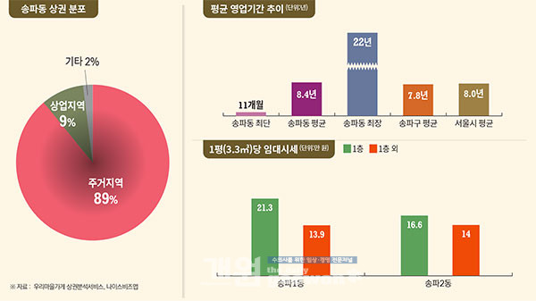 석촌호수부터 송리단길에 이르는 상권이 급격한 성장세를 보이자 송파2동의 상권은 다소 축소된 모습이다. 송파2동의 건물 평균 임대료는 15만 3천 원 수준으로 1층과 1층 외 임대료의 차이가 거의 없다.