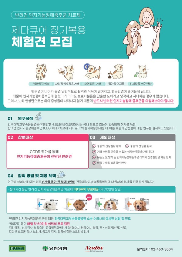 건국대학교 동물병원(병원장 윤헌영)이 반려견 인지기능장애증후군(CDS) 신약 ‘제다큐어’ 장기복용 참여견을 모집한다.