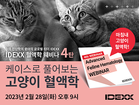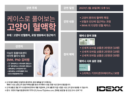 웨비나 신청은 2월 27일(월) 오후 6시까지 사전신청 링크(forms.gle/9x1HNXLjsfre5ZGt6) 또는 IDEXX 카카오톡 채널 웨비나 안내 공지사항에 연결된 링크로 하면 된다.
