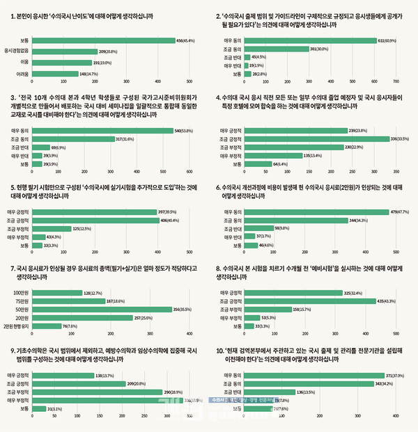 대한수의사회 청년특별위원회가 2030 수의사 대상 ‘백문벳답’ 5가지 분야 총 50문항에 대해 2022년 1월 한달 간 설문조사를 실시, ‘수의사 국가시험’ 분야 10개 항목을 질의한 결과 수의국시 난이도에 대해서는 ‘보통’(45.4%)이 가장 많았으며, ‘어렵다’고 답한 응답자는 14.7%에 불과했다. ‘수의국시 출제 범위 및 가이드라인이 구체적으로 규정되고 응시생들에게 공개될 필요가 있다’고 답한 응답자는 90.9%를 차지했으며, ‘적극 동의’한 경우도 60.9%나 됐다. ‘전국 10개 수의대 본과 4학년 학생들로 구성된 국가고시준비위원회가 제작 배포하는 국시 대비 세미나집을 일괄적으로 통합해 동일한 교재로 국시를 대비해야 한다’는 의견에는 85.4%가 동의했으며, ‘매우 동의’도 53.8%에 달했다. ‘수의국시에 실기시험을 추가적으로 도입’하는 것에 대해서는 ‘긍정적’인 답변이 79.9%로 나왔다. 수의국시 개선으로 인해 발생하게 될 수의국시 응시료 인상에 대해서는 ‘긍정적’이라는 답변이 82.0%로 나타났는데, 적당한 응시료 총액(필기+실기)은 ‘50만원’이 35.5%로 가장 많았으며, ‘20만원’(25.6%), ‘75만원’(18.6%) 순으로 나타났다. ‘100만원’도 12.7%, ‘2만원 현행 유지’는 7.6%였다. 수의국시 본 시험을 치르기 수개월 전 ‘예비시험’을 실시하는 것에 대해서도 ‘긍정적’이라는 답변이 75.7%를 차지했으며, ‘현재 검역본부에서 주관하고 있는 국시 출제 및 관리를 전문기관을 설립해 이전해야 한다’는 의견에 71.2%가 동의했다. <편집자주> ※각 문항 응답수 1,004명