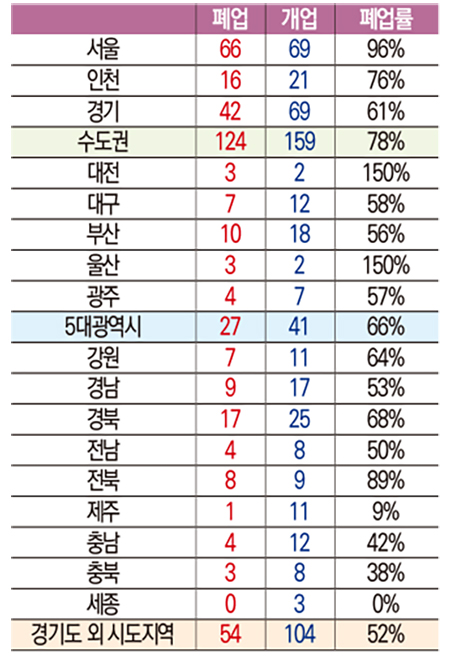다음은 대한수의사회에서 2017.10월~ 2018.10월 시도별 동물병원 폐업률 통계이다.