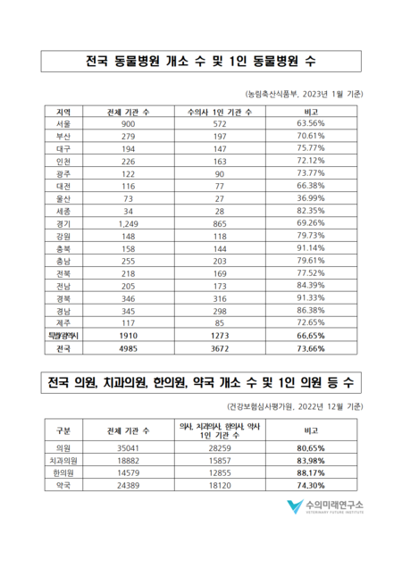 또한 농장동물 동물병원 대부분이 1인 동물병원임을 감안해 특별시와 6개의 광역시에 한정했을 경우 해당 수치는 66.65%로 감소한다. 즉, 수의사 2인 이상 동물병원의 비율이 33.35%에 육박한다는 것이다.
