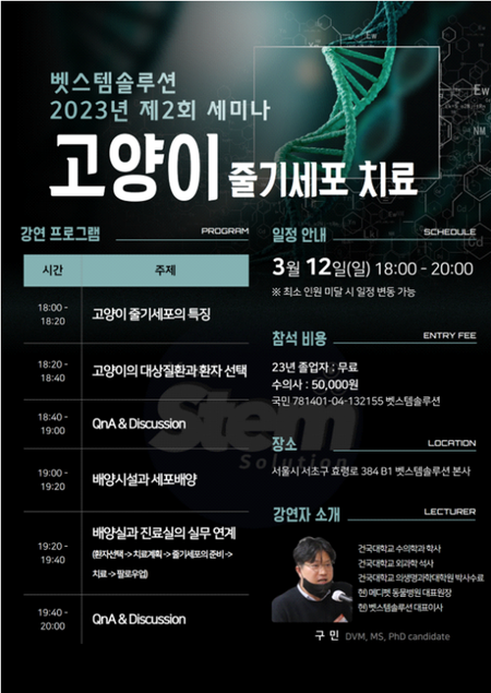 ‘고양이 줄기세포 치료’를 주제로 진행되는 이번 세미나는 구민(메디펫동물병원 원장) 대표가 연자로 나서 고양이들을 위한 줄기세포 치료의 전반과 배양 시설에 대한 이해 및 고양이들의 대표적인 난치병 치료를 위한 줄기세포의 가능성에 대해 강의할 예정이다.
