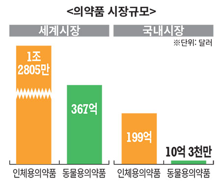 하지만 아직까지도 동물병원에서는 인체용의약품을 우선적으로 사용하는 것이 현실이다. ‘동물에 사용하는 인체용의약품 관리제도 개선 방안 연구’ 보고서에 따르면 이미 허가된 동물용의약품이 있음에도 인체용의약품을 쓰는 경우가 약효 분류 기준 48%에 달했다. 동물병원에서 동물용의약품이 더 많이 쓰인다면 국내 시장의 성장은 훨씬 더 가속화될 전망이다.