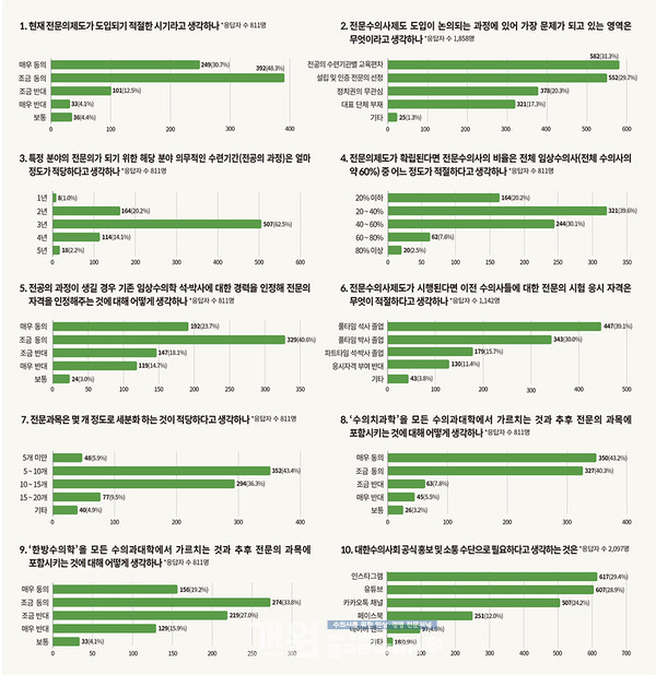 대한수의사회 청년특별위원회가 2030 수의사 대상 ‘백문벳답’ 5가지 분야 총 50문항에 대해 2022년 1월 한달 간 설문조사를 실시해 ‘전문의’ 관련 항목을 질의한 결과, 현재 전문수의사제도 도입이 적절한 시기라는 데 79%가 동의했다. 전문수의사제도 도입 논의 과정에서 가장 문제가 되는 것으로 ‘전공의 수련기관별 교육편차’(31.3%)를 가장 많이 꼽았으며, 이어 ‘설립 및 인증 전문의 선정’(29.7%), ‘정치권의 무관심’(20.3%), ‘대표 단체 부재’(17.3%)를 들었다. 특정 분야 전문의가 되기 위한 의무 수련기간으로는 3년(62.5%)이 가장 적합하다고 생각했으며, 임상수의사 중 전문수의사의 비율은 20~40%가 가장 적절하다고 답했다. 전공의 과정이 생길 경우 기존 임상수의학 석〮박사 경력 인정에 대해서는 ‘동의’가 64.3%로 많았다. 전문수의사제도가 시행될 경우 이전 수의사들의 전문의 시험 응시 자격으로는 ‘풀타임 석사 졸업’이 39.1%로 가장 많았으며, ‘응시자격 부여 반대’도 11.4%나 있었다. 적합한 전문과목 수는 5~10개(43.4%)가 가장 많았으며, 이어 10~15개(36.3%)로 조사됐다. ‘수의치과학’을 모든 수의과대학에서 가르치는 것과 추후 전문의 과목에 포함시키는 것에 대해서는 ‘동의’가 83.5%로 압도적으로 많은 반면 ‘한방수의학’은 ‘동의’가 53%인데 반해 ‘반대’도 42.9%에 달했다. 대한수의사회 공식 홍보 및 소통 수단으로는 ‘인스타그램’이 29.4%로 가장 많이 선호했으며, 유튜브(28.9%), 카카오톡 채널(24.2%), 페이스북(12.0%) 순으로 나타났다. <편집자주>