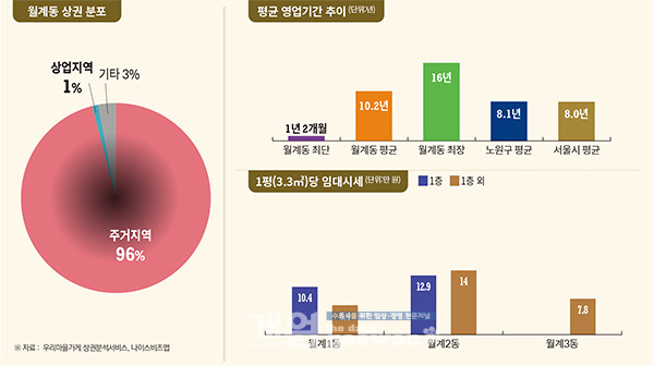 원인은 상권에서 찾아볼 수 있는데, 아파트 밀집 지역인 월계1·3동은 대로변이 아닌 단지 내 상가 소형 점포들이 많고, 업종도 주로 코인 세탁소나 커피 전문점 등으로 소자본 창업이 주로 이뤄지고 있어 낮은 임대료를 보인다.