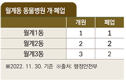행정안전부 최신 데이터에 따르면, 서울시 노원구 월계동은 2004년부터 동물병원이 개원하기 시작해 2022년 11월 30일까지 총 11개소가 개원, 이 중 5개소(45%)가 문을 닫고, 6개소(55%)가 개원을 유지하고 있다.