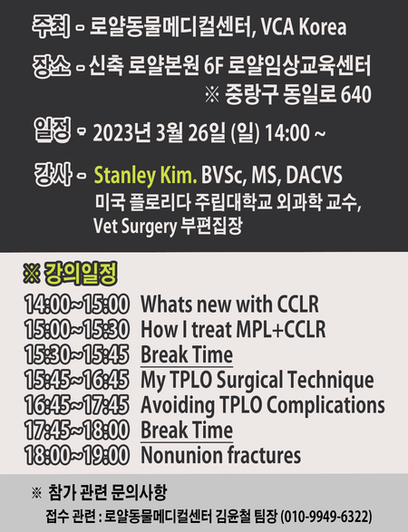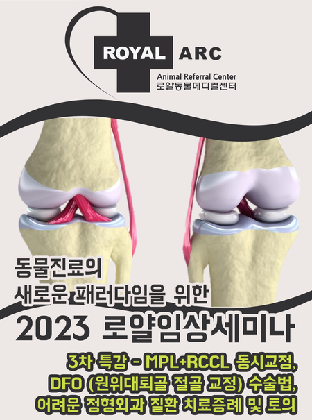 로얄동물메디컬센터와 VCA KOREA(한국임상수의사협회)가 동물진료의 새로운 패러다임을 위한 ‘2023 로얄임상세미나 3차 특강’을 오는 3월 26일(일) 오후 2시부터 7시까지 로얄동물메디컬센터 본원 6층 로얄임상교육센터에서 개최한다.