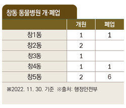 행정안전부 최신 데이터에 따르면, 도봉구 창동은 1994년부터 동물병원이 개원하기 시작해 2022년 11월 30일까지 총 15개소가 개원, 이 중 8개소(53%)가 문을 닫고, 7개소(47%)가 개원을 유지하고 있다.
