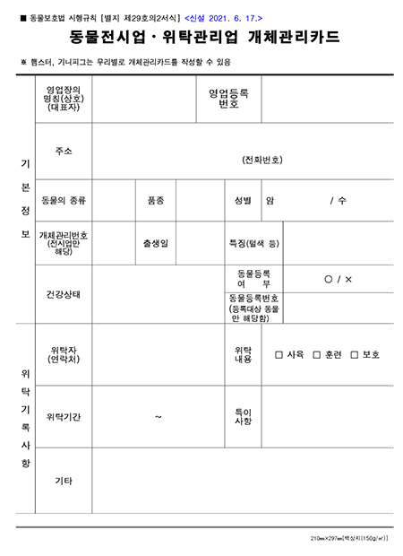 영업자는 동물보호법 시행규칙의 내용들이 담긴 계약서를 제공해야 한다. 위탁관리업자는 동물에 대하여 별지에 따른 개체관리카드를 작성하고 비치해야 한다<표>.