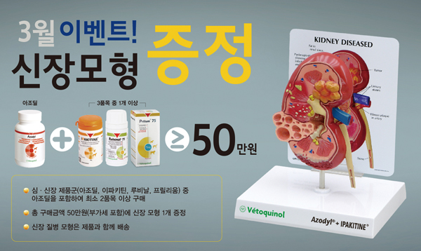 심·신장 제품군인 ‘아조딜’과 함께 ‘이파키틴’, ‘루비날’, ‘프릴리움’ 3품목 중 1개 품목 이상의 제품을 구매한 금액이 50만원(부가세 포함)을 초과하면 신장 모형을 증정하는 행사다.
