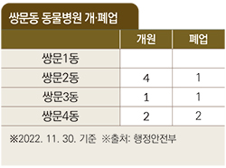 쌍문동 내 동물병원 평균 영업 기간은 11.9년으로 도봉구 평균(8.6년)과 서울시 전체 평균(8년)을 훌쩍 뛰어넘는다. 최장 영업 기간은 33년으로 1990년 개원한 A 동물병원은 현재도 성업 중이다.