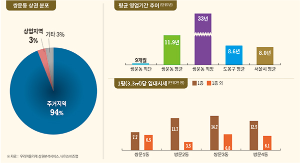 쌍문동은 도봉구 내에서 가장 아파트 밀집도가 높은 곳으로 만화영화 ‘아기공룡 둘리’와 인기 드라마 ‘응답하라 1988’의 주인공들이 살았던 곳으로 유명하다.