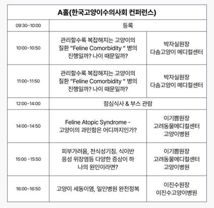 A홀에서는 ‘한국고양이수의사회 컨퍼런스’가 열린다. 박자실(다솜고양이메디컬센터) 원장이 ‘관리할수록 복잡해지는 고양이 질환 Feline Comorbidity 병의 진행일까 나이 때문일까?’를, 이기쁨(고려동물메디컬센터 고양이병원) 원장이 ‘Feline Atopic Syndrome: 고양이의 과민함은 어디까지인가’ 등에 대해 강의한다. 이진수(이진수고양이병원) 원장은 ‘고양이 세동이염, 1인 병원 완전 정복’을 다룰 예정이다.