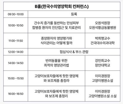 B홀에서는 ‘한국수의영양학회 컨퍼런스’가 진행된다. 오원석(황금동물병원), 이미경(고양이병원 소설) 원장이 각각 ‘간수치 증가를 동반하는 만성치부 합병증 환자의 진단접근 및 치료관리’와 ‘고양이 보호자들에게 핫한 영양제와 보조제 총정리’를 다루고, 박희명(건국대 수의대), 강민희(장안대 바이오동물보호과) 교수가 각각 ‘종양환자의 영양평가와 식이관리는 어떻게 할까’, ‘반려동물을 위한 최적의 영양관리법’을 강의한다.