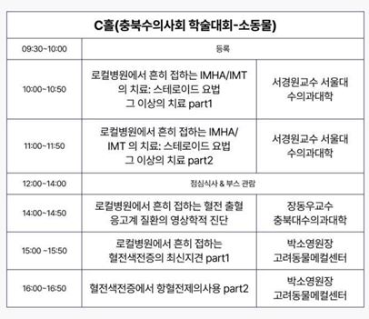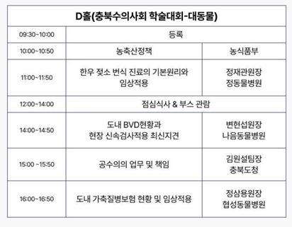 C, D홀에서는 ‘충북수의사회 학술대회’가 진행된다. C홀에서는 ‘소동물’을 주제로 서경원(서울대 수의대), 장동우(충북대 수의대) 교수가 각각 ‘로컬병원에서 흔히 접하는 IMHA/IMT의 치료: 스테로이드 요법 그 이상의 치료’, ‘로컬병원에서 흔히 접하는 혈전 출혈 응고계 질환의 영상학적 진단’을 강의하고, 박소영(고려동물메디컬센터) 원장이 ‘혈전색전증에서 항혈전제의 사용’을 다룬다. D홀에서는 ‘대동물’을 주제로 농림축산검역본부에서 재난성 가축전염병 최근 발생동향과 역학조사의 중요성을 설명하는 시간을 갖고, ‘한우 젖소 번식 진료의 기본원리와 임상적용’ 등에 대한 임상강의가 진행된다.