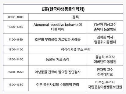 E홀에서는 ‘한국야생동물의학회 컨퍼런스’가 진행된다. 김선아(충북대동물병원), 한재익(전북대) 교수가 각각 ‘Abnormal repetitive behavior에 대한 이해’와 ‘야생동물진료에 필요한 진단검사’를 강의하고, 김희종(멸종위기종센터) 박사가 ‘조류의 부리골절 치료법과 사례’를 공유할 예정이다.