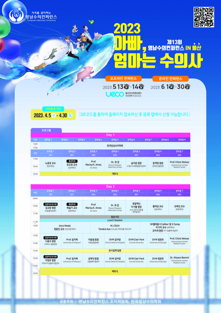 이번 영남수의컨퍼런스는 ‘2023 한국임상수의학회 춘계학술대회’와 동시 개최한다. 임상수의학회 춘계학술대회는 첫째 날인 13일 오후 1시부터 5시까지 진행될 예정이다.