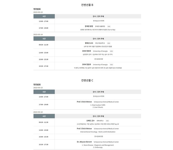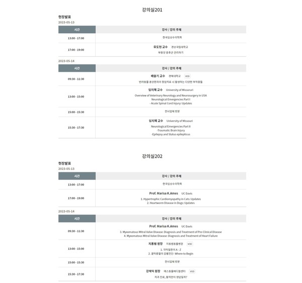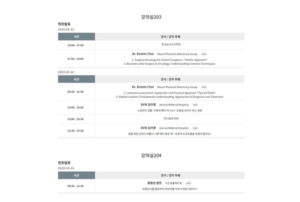이후 오후 5시부터 7시까지는 총 7개의 임상 강의가 동시에 진행된다. 노윤호·유도현(경상대) 교수가 각각 뇌수술과 부종양 증후군을, Marisa K.Ames(UC Davis) 교수가 ‘고양이 비대성 심근증’을, 최강(Mount Pleasant Veterinary Group) 수의사가 ‘종양학’에 대해 강의하고, 송치윤(수원24시바른동물의료센터) 원장이 ‘고양이 아토피’를, 장재영(장재영외과동물병원) 원장이 ‘뒷다리 정형외과 질환’을, Chick Weisse(Schwarzman Animal Medical Center) 교수가 ‘SUBS 배치법’을 소개한다.