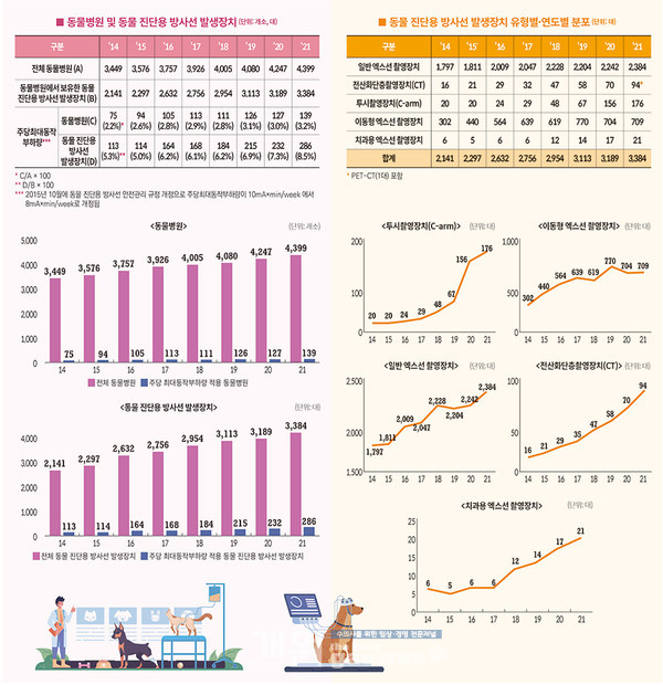 국세청 국세통계 자료에 따르면, 2021년 국내 동물병원 수는 4,399개소로 전국에 보유한 동물 진단용 방사선 발생장치는 2021년 3월 31일 기준 총 3,384대로 조사됐다. 이 중 주당최대동작부하량(8mA·min/week초과)에 적용받는 동물병원 및 동물 진단용 방사선 발생장치 수는 각각 139개소(3.2%), 286대(8.5%)였다.