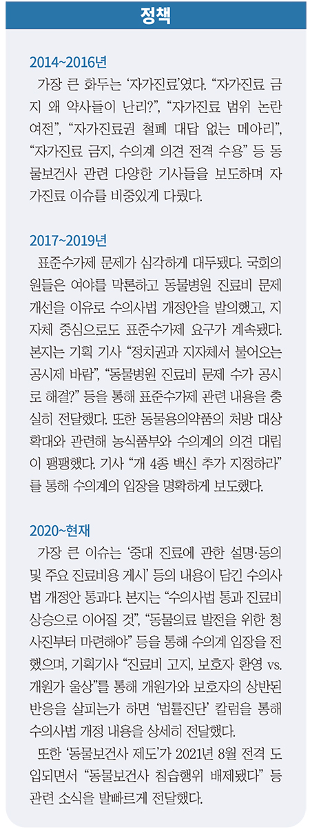 가장 큰 이슈는 ‘중대 진료에 관한 설명·동의 및 주요 진료비용 게시’ 등의 내용이 담긴 수의사법 개정안 통과다. 본지는 “수의사법 통과 진료비 상승으로 이어질 것”, “동물의료 발전을 위한 청사진부터 마련해야” 등을 통해 수의계 입장을 전했으며, 기획기사 “진료비 고지, 보호자 환영 vs. 개원가 울상”를 통해 개원가와 보호자의 상반된 반응을 살피는가 하면 ‘법률진단’ 칼럼을 통해 수의사법 개정 내용을 상세히 전달했다.
