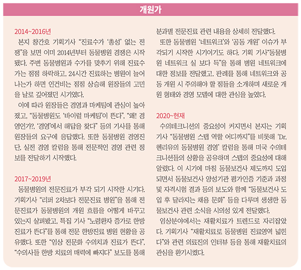 수의테크니션의 중요성이 커지면서 본지는 기획기사 “동물병원 스탭 역할 어디까지”를 비롯해 ‘Dr.헨리유의 동물병원 경영’ 칼럼을 통해 미국 수의테크니션들의 상황을 공유하며 스탭의 중요성에 대해 알렸다. 이 시기에 마침 동물보건사 제도까지 도입되면서 동물보건사 양성기관 평가인증 기준과 과정 및 자격시험 결과 등의 보도와 함께 “동물보건사 도입 후 달라지는 채용 문화” 등을 다루며 생생한 동물보건사 관련 소식을 시의성 있게 전달했다.