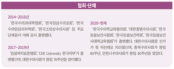 ‘한국수의과대학협회’, ‘한국임상수의포럼’, ‘한국수의임상피부학회’, ‘한국소임상수의사회’ 등 주요 단체들이 이때 공식 출범했다.