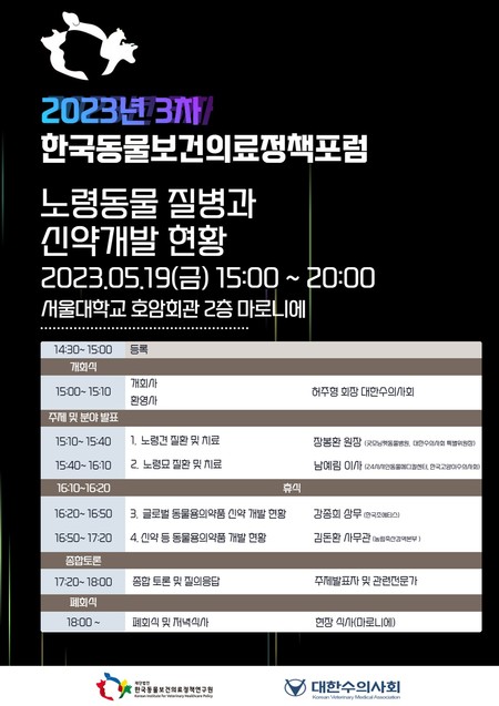 한국동물보건의료정책연구원(이사장 허주형)이 주최하는 ‘2023 제3차 한국동물보건의료정책포럼’이 5월 19일(금) 오후 3시부터 8시까지 서울대학교 호암교수회관 마로니에홀에서 개최된다.