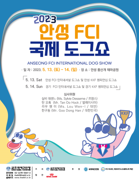 (사)한국애견연맹(총재 송하경)이 ‘2023 안성 FCI 국제 도그쇼 및 KKF 챔피언십 도그쇼’를 오는 5월 13일(토)부터 14일(일)까지 이틀간 경기도 안성시 풍산개테마공원에서 개최한다.