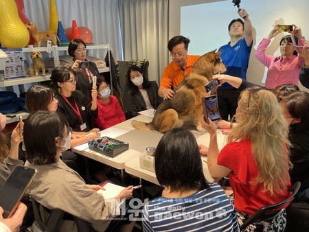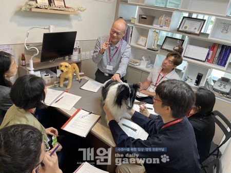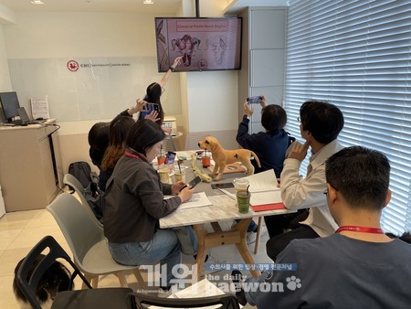 이어 오후에는 Xie 교수가 모형이 아닌 실제 개를 통해 한방수의학 케이스를 바탕으로 임상 현장에서의 적용법 강의에 나섰다. 참가자들은 모든 강의 장면을 휴대폰으로 찍고 기록하는 등 열정적으로 참여하며 한방수의학에 대한 높은 관심을 보였다.
