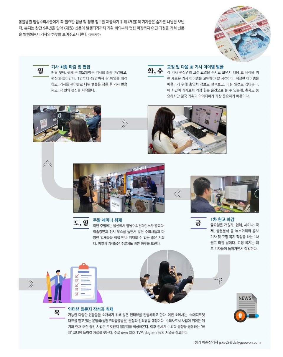 동물병원 임상수의사들에게 꼭 필요한 임상 및 경영 정보를 제공하기 위해 <개원>의 기자들은 숨가쁜 나날을 보낸다. 본지는 창간 9주년을 맞아 <개원> 신문이 발행되기까지 기획 회의부터 편집 마감까지 어떤 과정을 거쳐 신문을 발행하는지 기자의 하루를 보여주고자 한다. <편집자주>