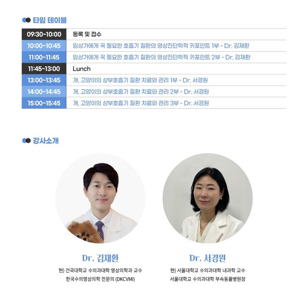 연수교육에서는 김재환(건국대) 교수가 ‘임상가에게 꼭 필요한 호흡기질환의 영상진단학적 키포인트’를, 서경원(서울대) 교수가 ‘개, 고양이의 상부호흡기 질환 치료와 관리’를 각각 오전과 오후에 진행한다.