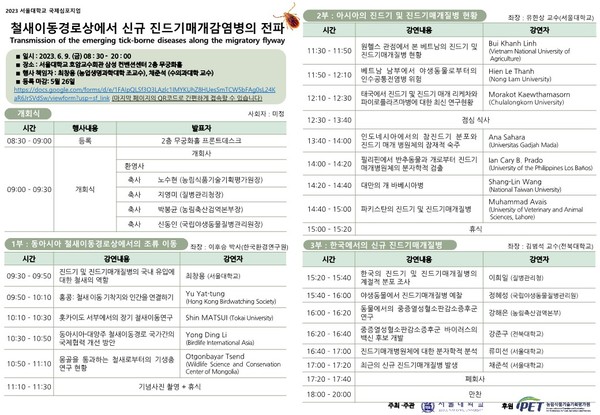 IPET(농림수산식품기술기획평가원) 연구지원과 서울대 산학협력단의 지원으로 개최되는 이번 심포지엄은 ‘철새이동경로상에서 신규 진드기매개감염병의 전파’를 주제로 국내에서 처음으로 아시아 철새이동경로에 있는 국가들의 조류학자, 진드기 및 진드기매개질병 연구자들이 함께 모여 관련 정보 교류에 나설 것으로 알려져 기대를 모으고 있다.