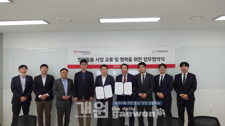 광동생활건강㈜(대표 엄승섭)과 ㈜온힐(대표 김도형, 유정우)이 반려동물 사업 발전과 우호 증진을 위한 업무 협약을 체결했다.