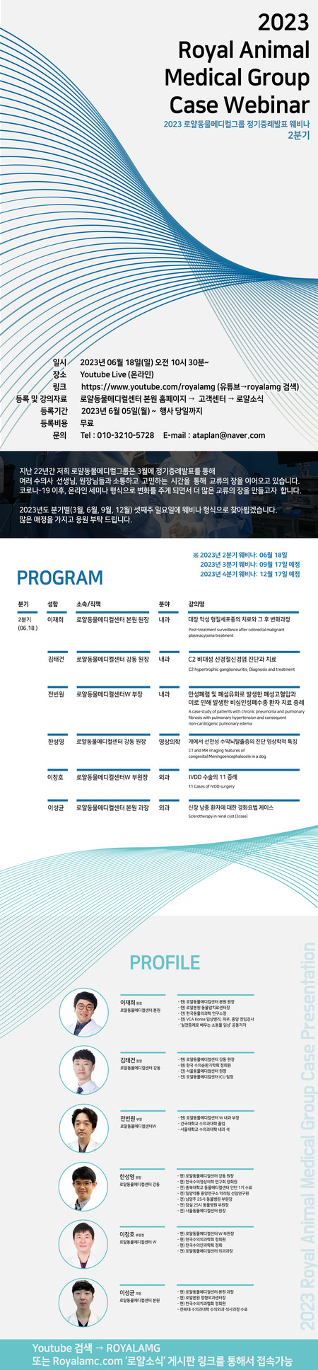 증례발표회에는 로얄동물메디컬센터 본원 이재희 원장, 이성균 과장과 로얄동물메디컬센터 강동 김태건, 한성영 원장, 로얄동물메디컬센터W 이창호 부원장, 전빈원 부장 총 6명의 의료진이 연자로 나선다.
