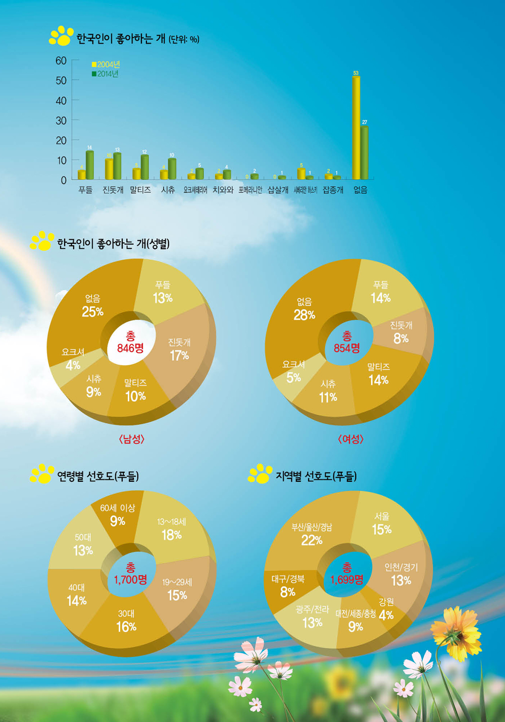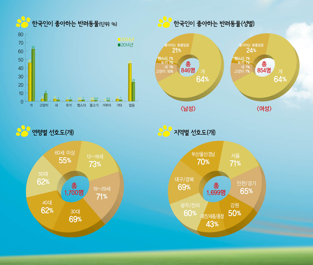 ‘키우고 싶거나 좋아하는 동물이 없다’는 대답도 2004년 46%였던 것이 2014년에는 23%로 절반이 줄어들면서 점차 반려동물에 대한 관심이 높아지고 있는 것으로 조사됐다. 한국인이 좋아하는 개는 2004년에 진돗개(10%)가 1위였던 것이 10년이 지난 2014년에는 푸들(14%)로 바뀌었으며, 그 뒤를 이어 진돗개(13%), 말티즈(12%), 시츄(10%), 요크셔테리어(5%), 치와아(4%), 포메라니안(2%) 순으로 나타났다. 이밖에 삽살개, 시베리안 허스키, 잡종개가 각 1%를 나타냈다. 2004년에는 1위 진돗개에 이어 말티즈와 시베리안 허스키가 각각 5%로 공동 2위를 차지했으며, 이어 푸들과 시츄가 각 4%, 요크셔테리어, 치와와, 잡종개가 각 2% 순으로 나타났다. <편집자주>