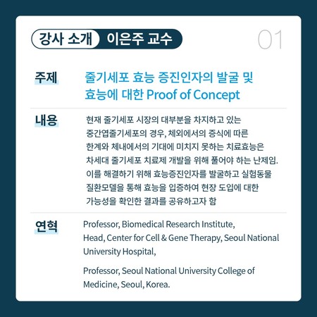 이은주(서울대병원) 교수는 ‘줄기세포 효능 증진인자의 발굴 및 효능에 대한 Proof of Concept’을 소개하고, 이영진(대웅제약 세포치료센터) 센터장은 ‘반려동물 재생치료제 개발을 위한 세포유전자치료제 개발 현황과 미래’를 다룰 예정이다.