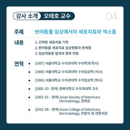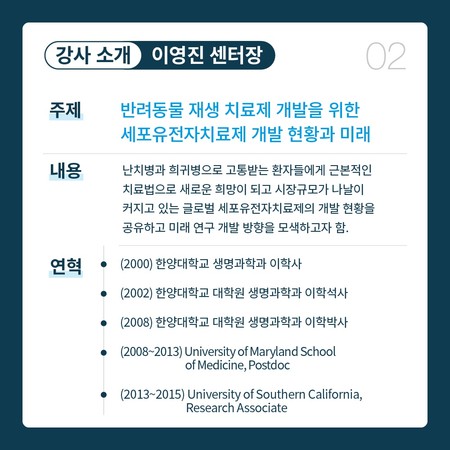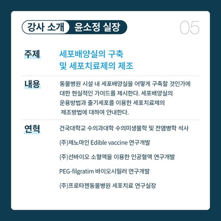 이어 윤소정(프로타젠동물병원) 세포치료 연구실장이 ‘세포배양실의 구축 및 세포치료제의 제조’를 강의할 계획이다.